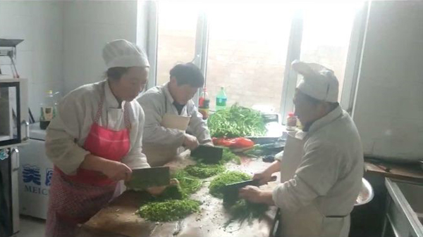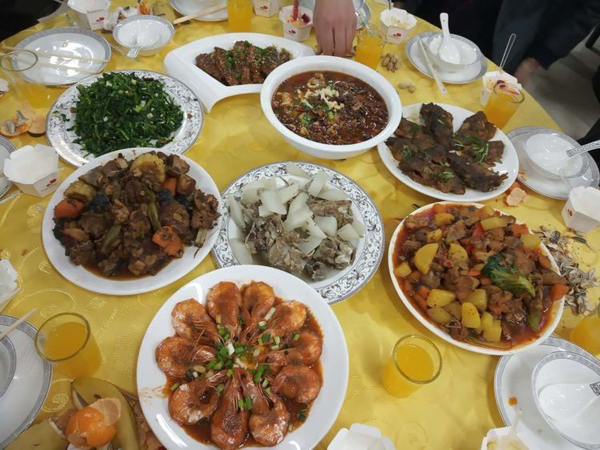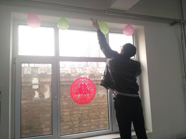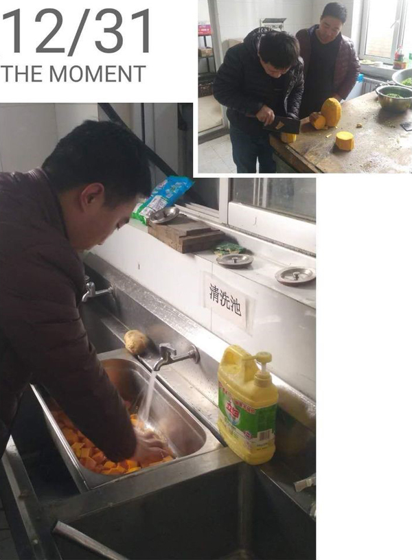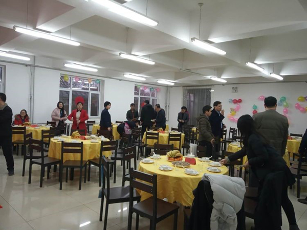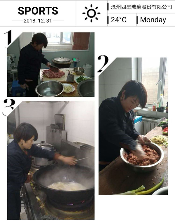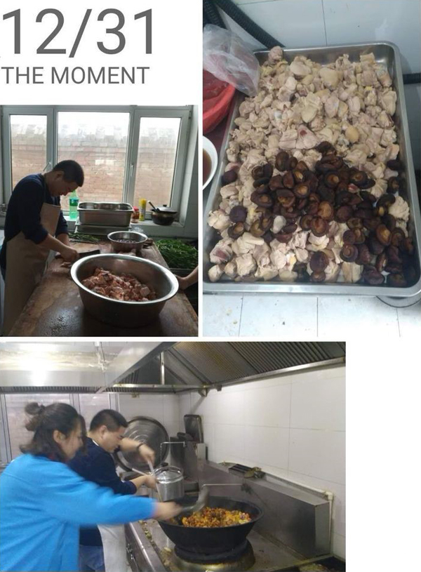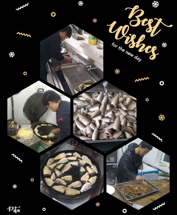 大家伙共同布置我們的會(huì)場,貼福字,掛條幅,換桌布,有些同事自己從家里拿案板與廚具。四星也是我們的家。